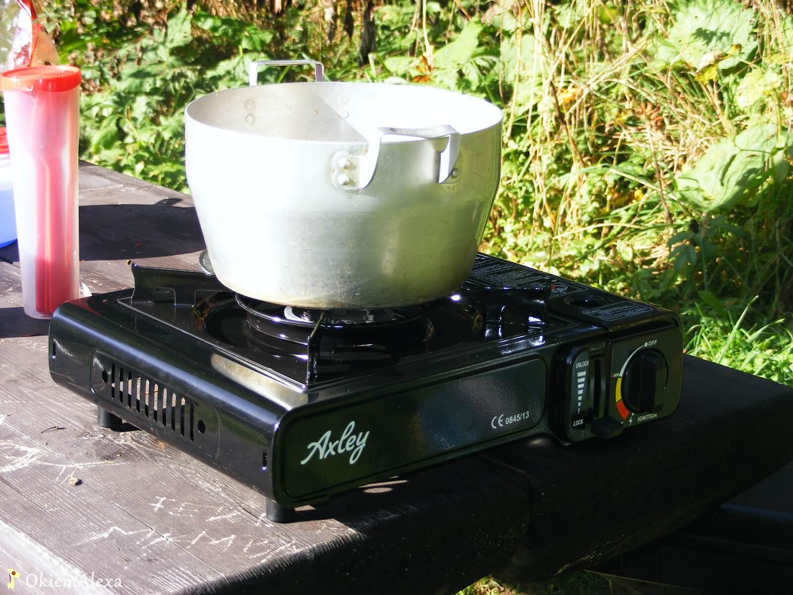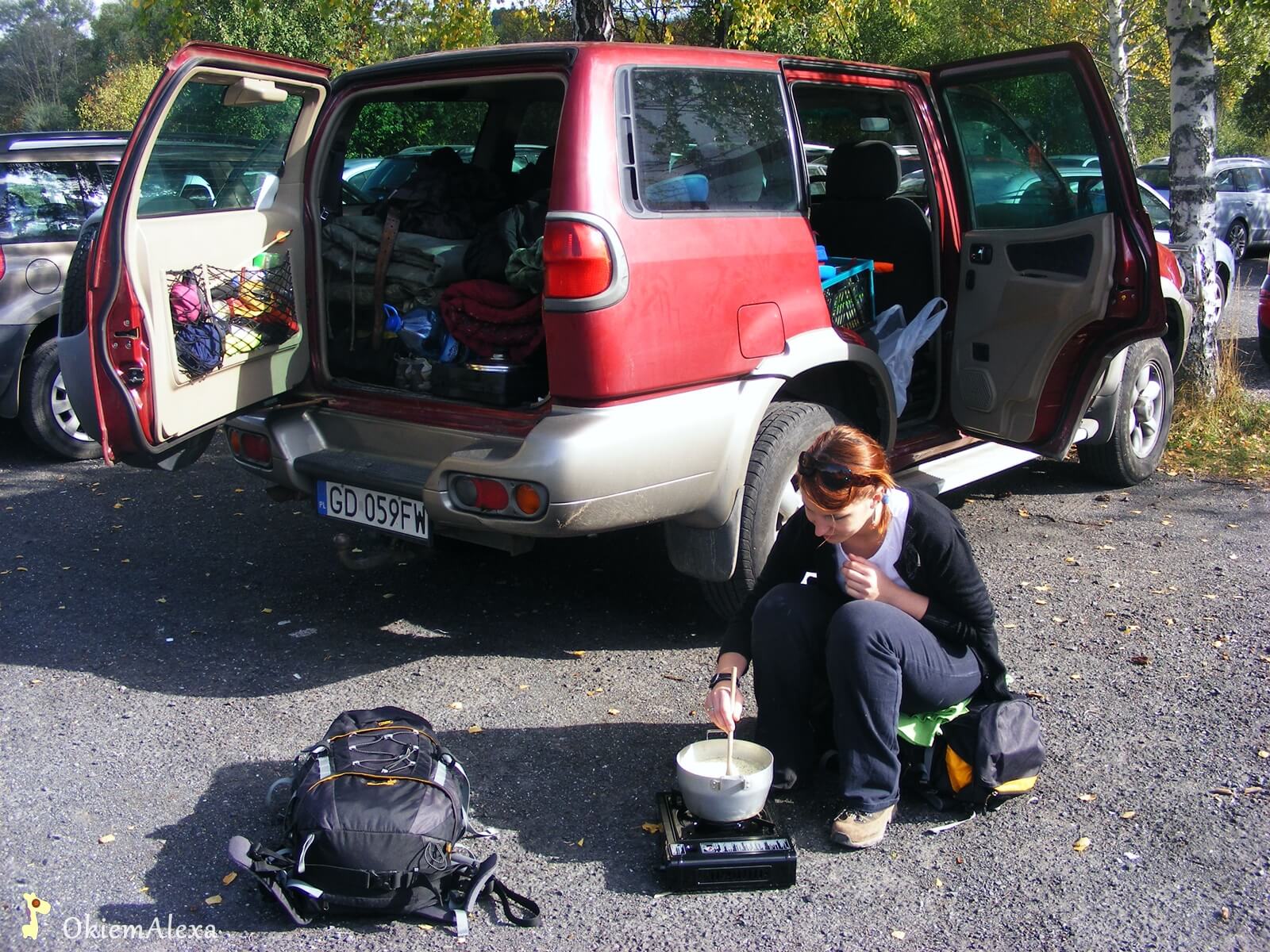 - Jechaliśmy w wariancie niskobudżetowym. Część jedzenia zabraliśmy ze sobą. Choć jednym z przyjemniejszych aspektów podróżowania jest jedzenie i próbowanie lokalnych smakołyków, to w ramach obniżenia nieco kosztów + bycia gotowym „na wszystko” mieliśmy ze sobą trochę makaronu, sosu itp. Zabraliśmy też ze sobą kuchenkę turystyczną i podstawowy sprzęt kuchenny. Dzięki temu zjedliśmy kilka kolacji w naprawdę fajnych biwakowych warunkach:).