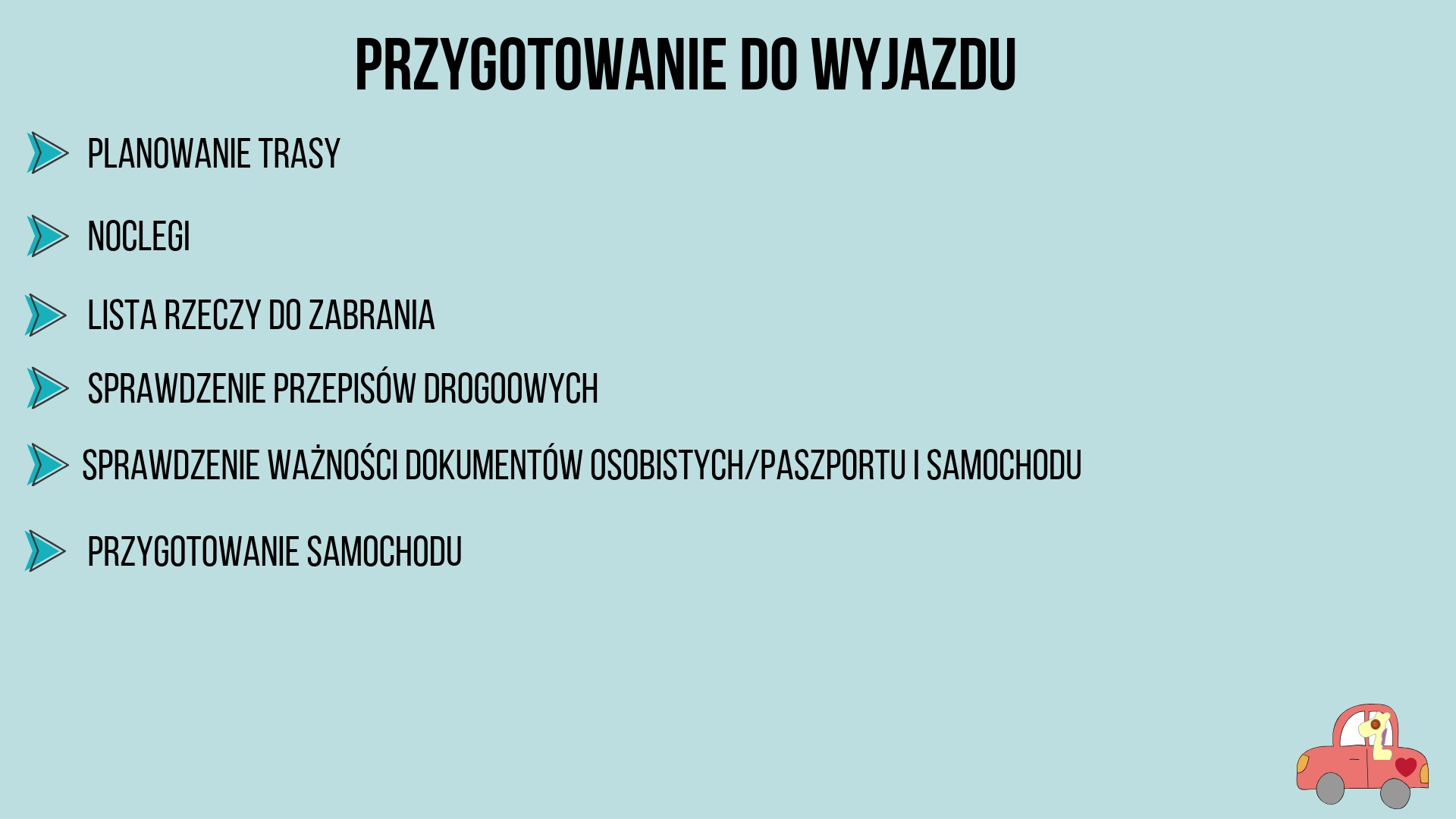 Gdy trasa jest wybrana,a rodzaj noclegów określony tworzymy listę niezbędnych rzeczy do zabrania i sprawdzamy przepisy drogowe w krajach, do których się wybieramy. Warto dobrze rozplanować w jaki sposób się pakujecie aby wygodnie się z tego korzystało w czasie wyjazdu. U nas najlepiej sprawdza się zapakowanie ubrań w torby podróżne, jedzenia w skrzynki. Do tego zabieramy podręczne plecaki.