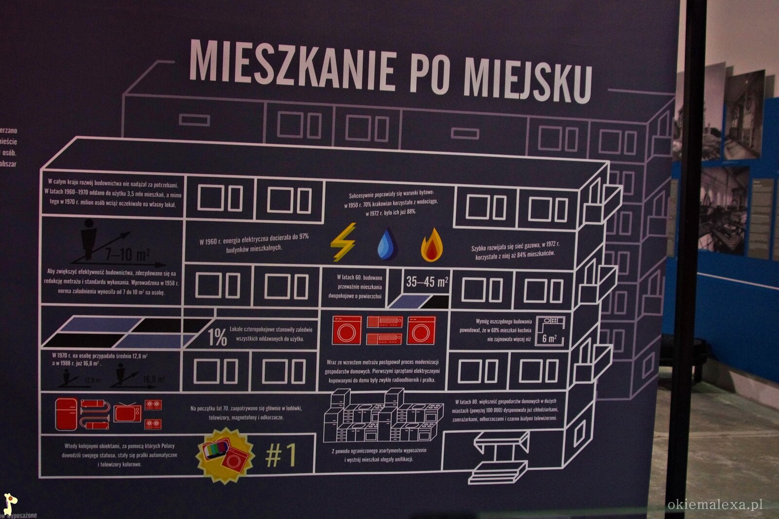 Dzięki  obrazkowi powyżej dowiadujemy się między innymi, że wraz ze wzrostem metrażu postępował proces modernizacji gospodarstw domowych. Pierwszymi sprzętami elektrycznymi kupowanymi do domu były radioodbiorniki i pralki, a obiektami dzięki którym Polacy dowodzili swojego statusu, stały się pralki automatyczne i telewizory. Dowiadujemy się również, że w latach 60 aby zwiększyć efektywność budownictwa zdecydowano się na zmniejszenie metrażu na 1 osobę z 10m2 do 7, obniżono także standard wykonania. Mieszkania czteropokojowe stanowiły zaledwie 1% oddawanych lokali do użytku! Ta część wystawy naprawdę przypadła nam do gustu.