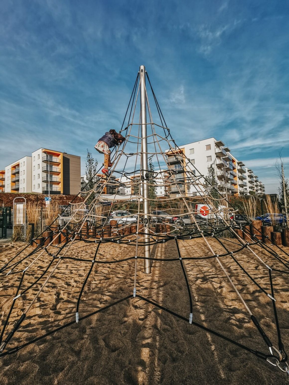 Na Garnizonie bywamy dość często, przy okazji, na chwilę. Tutejszy plac zabaw nie jest duży, ale pajęczyna działa jak magnez na dzieciaki. Zresztą, to nie chciał by się wspiąć tak wysoko? 😉 Pajęczyna ze względu na swoje pokaźne rozmiary jest przeznaczona raczej dla starszych dzieci, ale myślę, że 6-7 latki mogą już próbować swoich sił. Na mniejsze dzieci czeka obok nieduży plac zabaw (zjeżdżalnia, karuzela etc).